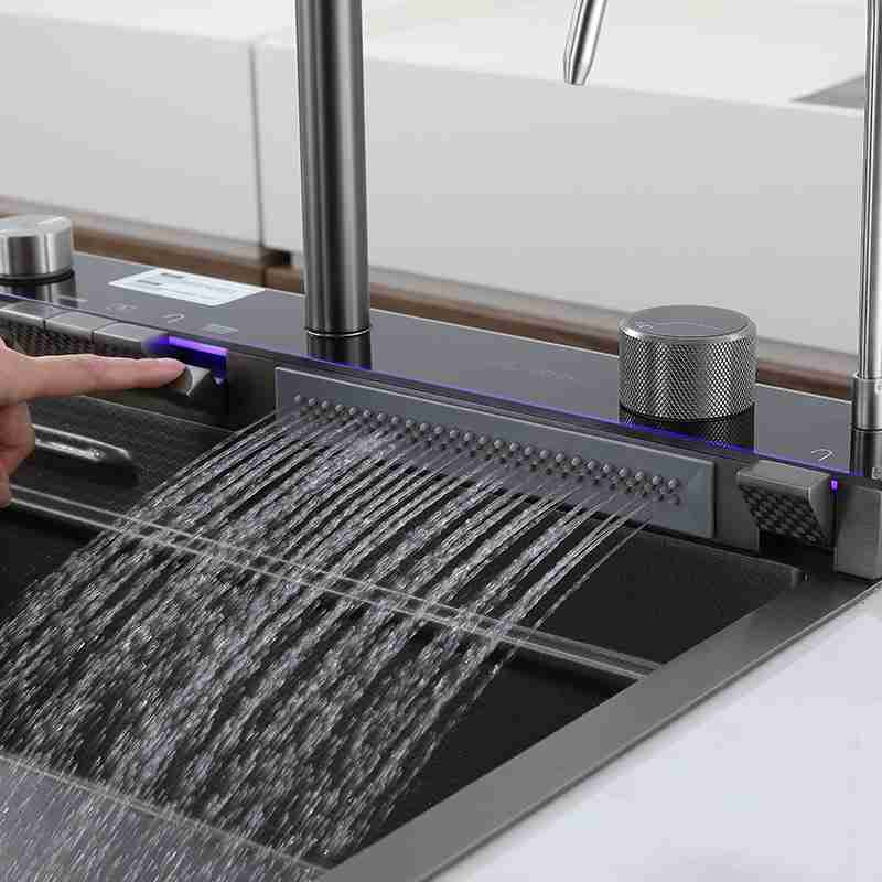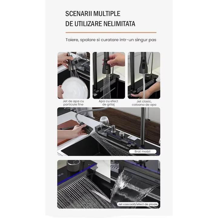 Economie de timp, economie de spațiu și o igienizare corectă a fiecărui tip de aliment pentru gătit ori a fiecărui tip de vas, incluzând patru moduri de spălare, cu robinet reglabil pentru diferite moduri de curgere, cu jet vertical pentru pahare și cu două tipuri de cascade (waterfall), una tip ploaie și una tip curgere continuă. În plus, primiți și untocător din lemn masivpe care să-l aveți la îndemână pentru a toca legumele spălate.